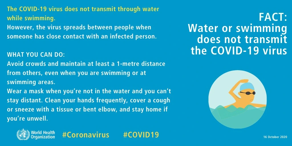 There is no evidence that the virus that causes COVID-19 can be spread to people through the water in pools, hot tubs, or water play areas. Proper operation and maintenance (including disinfection with chlorine and bromine) of these facilities should inactivate the virus in the water. Make sure to follow the SOPs out of the swimming pool. “WHO”